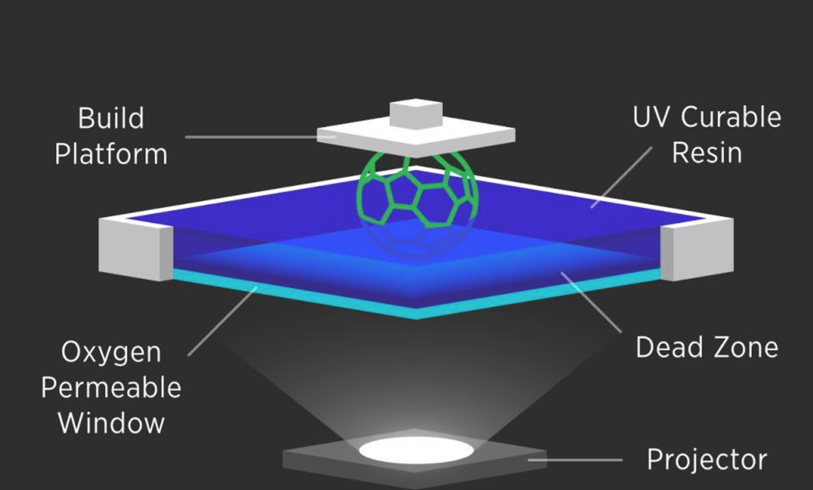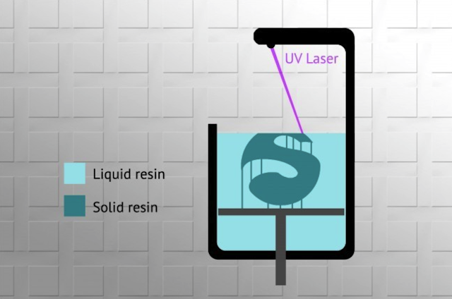 Dibuat dengan komponen utama sebuah tangki resin, sumber sinar UV dan Platform cetak. Pada prinsipnya obyek 3D seolah-olah dipotong-potong menjadi irisan sangat tipis (layer) oleh software mesin sehingga UV Laser akan menembakkan setiap irisan melintang ke permukaan resin sehingga resin mengeras dengan bentuk sesuai dengan bentuk yang ditembakkan oleh UV Laser. Platform cetak akan turun sedikit demi sedikit seiring dengan terbentuknya obyek 3D layer demi layer.