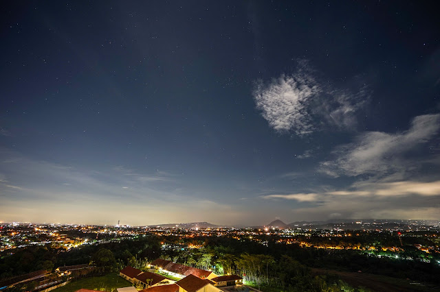 Ok, saya menginginkan tidak ada blur atau gagal fokus di hasil jepretan jadi pada saat motret lanskap di malam hari saya selalu menggunakan tripod, catat! :p. Tripod membantu kita pegangin kamera biar tidak goyang, kalau goyang pasti tidak fokus. Target saya pada saat motret dengan hasil seperti gambar di atas adalah bintang-bintang, anda bisa lihat kan bintang-bintangnya, fokus sempurna.