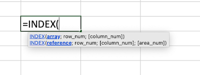 Baik, sejatinya rumus index excel ini fungsinya adalah untuk pencarian data dalam rentang tertentu. Pencariannya didasarkan atas nomor kolom (column num) dan nomor baris (row num). Di microsoft excel, jika kita tuliskan rumus index ini maka akan muncul 2(dua) jenis rumus excel index. Perhatikan gambar berikut,