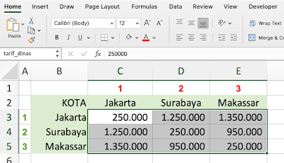 - Buatlah tabel seperti di atas, anggaplah dalam contoh ini kita akan mencari data tarif perjalanan dinas antar kota. Seperti materi-materi microsoft excel lainnya dalam website ini, kita biasakan untuk memberikan label atau nama untuk rentang data yang digunakan. Tujuannya adalah untuk mempermudah penggunaan rentang. Kita tinggal panggil label atau nama rentang data tersebut. Di contoh ini kita berikan label "tarif_dinas" untuk range data C3:E5. Caranya, blok rentang C3:E5 kemudian pada field 'name box' di sebelah kiri atas berikan nama "tarif_dinas".