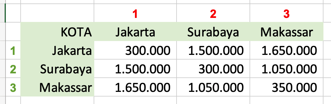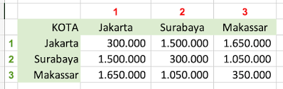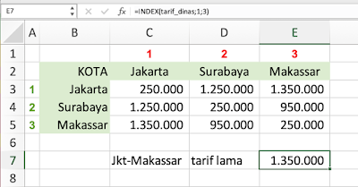 - Untuk mencari tarif perjalanan dinas dari Jakarta ke Makassar, Rumus yang dituliskan adalah =INDEX(tarif_dinas;1,3). Maka kita akan mendapatkan nilai 1.350.000.