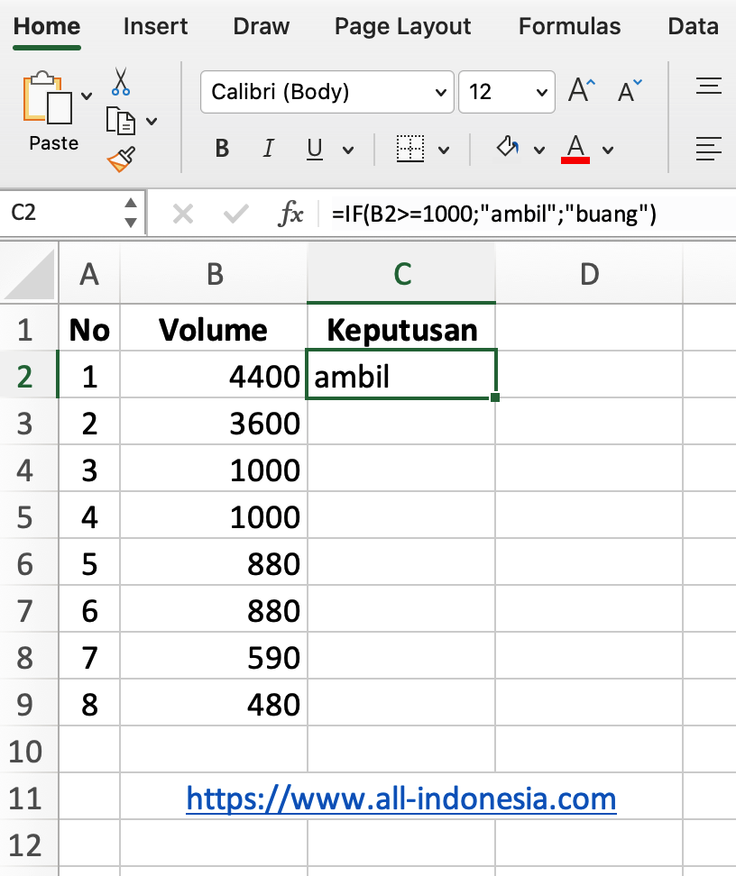 - Masukkan keluaran jika kondisi terpenuhi atau value if true dan keluaran jika kondisi tidak terpenuhi atau value if false. Disini kita tentukan jika kondisi B2>=1000 maka keputusannya adalah "ambil" jika tidak maka keputusannya adalah "buang". Rumus yang terbentuk adalah =IF(B2>=1000;"ambil";"buang"). Tekan Enter.