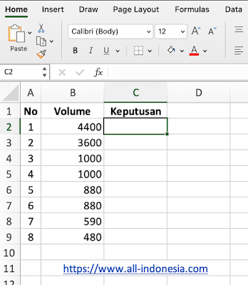 - Buat tabel seperti berikut atau sejenisnya, pilih cell tempat rumus IF ditempatkan. Di sini kita gunakan cell C2.