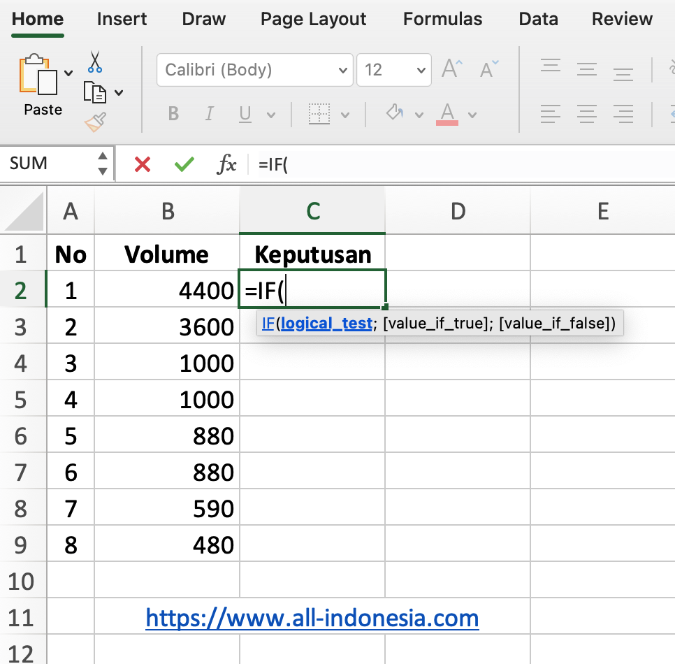- Masukkan logical test, yaitu kondisi yang akan diuji. Pada contoh ini kita akan menguji nilai kolom volume (kolom B), apakah volume lebih besar atau sama dengan 1000 atau tidak. Maka kondisinya adalah B2>=1000. Kemudian ketik ";" atau "," sesuaikan dengan versi microsoft excel anda.