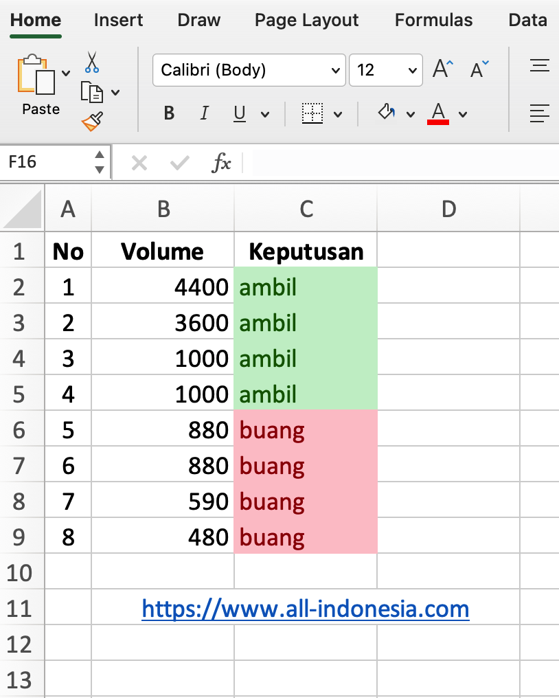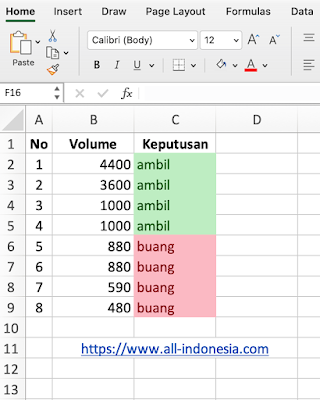 - Selesai!, Copy rumus IF tersebut ke baris bawahnya sesuai dengan jumlah data yang kita miliki. Kita akan dapati hasil rumus if di kolom keputusan. Warna merah dan hijau otomatis terbentuk jika kolom keputusan ini diolah dengan Conditional Formatting