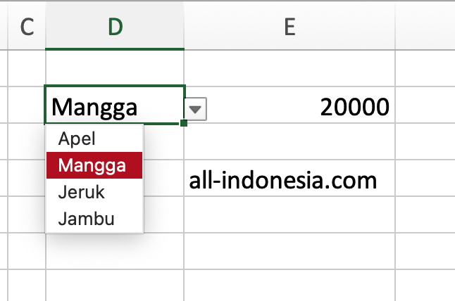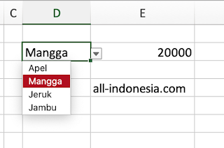 - Selesai, kita sudah bisa melihat menu dropdown list di cell D2. Download file latihan di sini. Selamat mencoba.