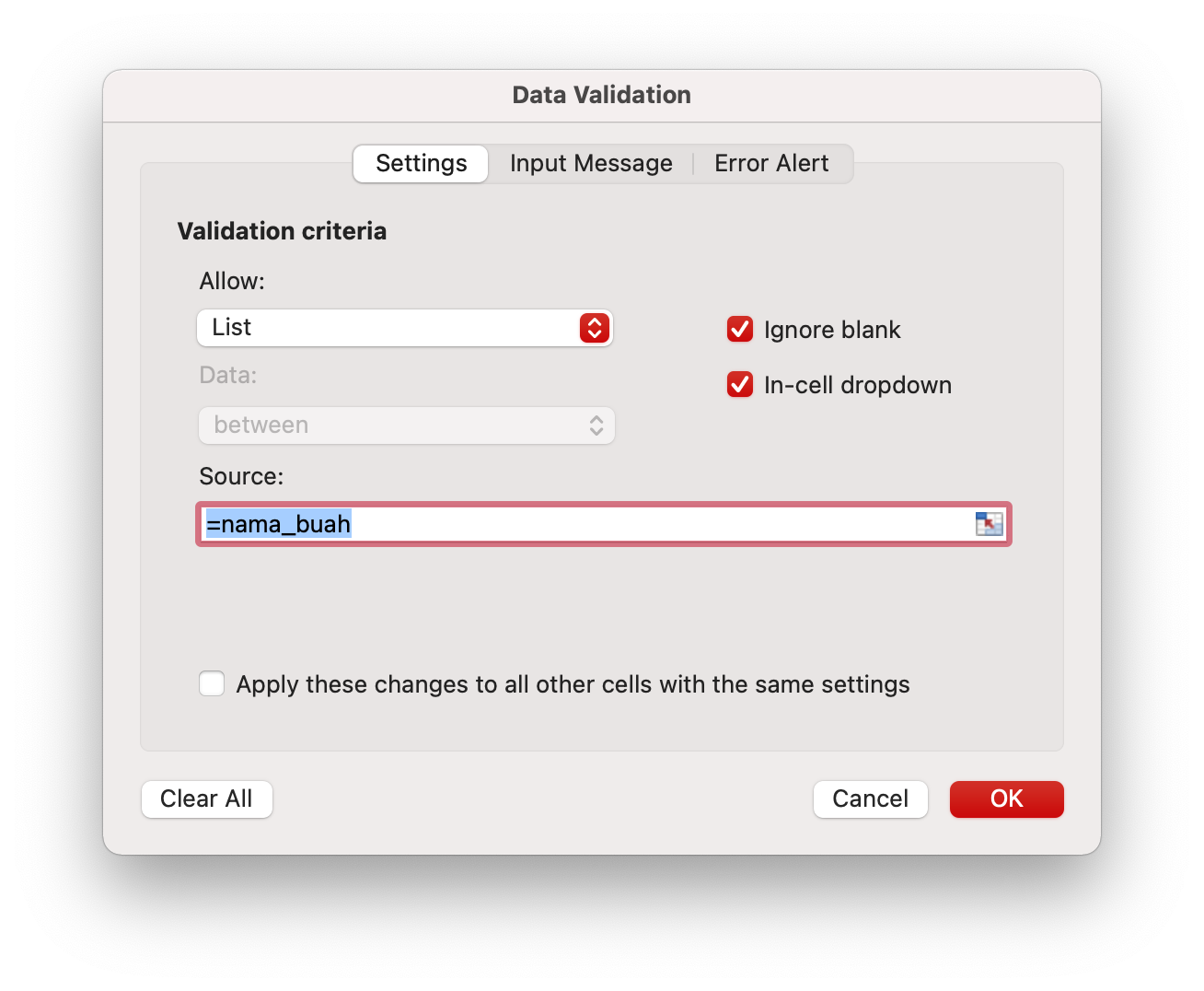 - Pilih "List" pada field Allow dan ketik "=nama_buah" pada field Source. Kemudian klik OK