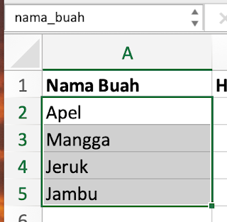 - Blok (klik + drag) nama-nama buah dari A2 ke A5, beri label blok tersebut dengan "nama_buah". Pemberian label pada blok data digunakan untuk mempermudah anda dalam mengingat dan memanfaatkan sekelompok data.