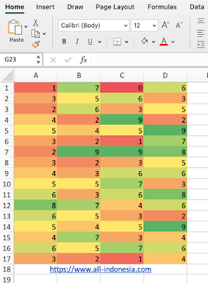 - Selesai, secara otomatis kita akan dapati cell data kita akan berubah warna sesuai dengan besar kecil angka atau data di dalamnya. Di contoh ini kita dapat lihat angka besar berwarna hijau dan berangsur merah di angka kecil.