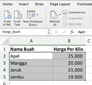 - Ketikkan label database yang telah kita buat di langkah nomor 2, yaitu "harga_buah" maka akan muncul hilight di database harga_buah kita. Kemudian ketik tanda ";" atau "," tanpa tanda petik, sesuaikan dengan versi excel anda.