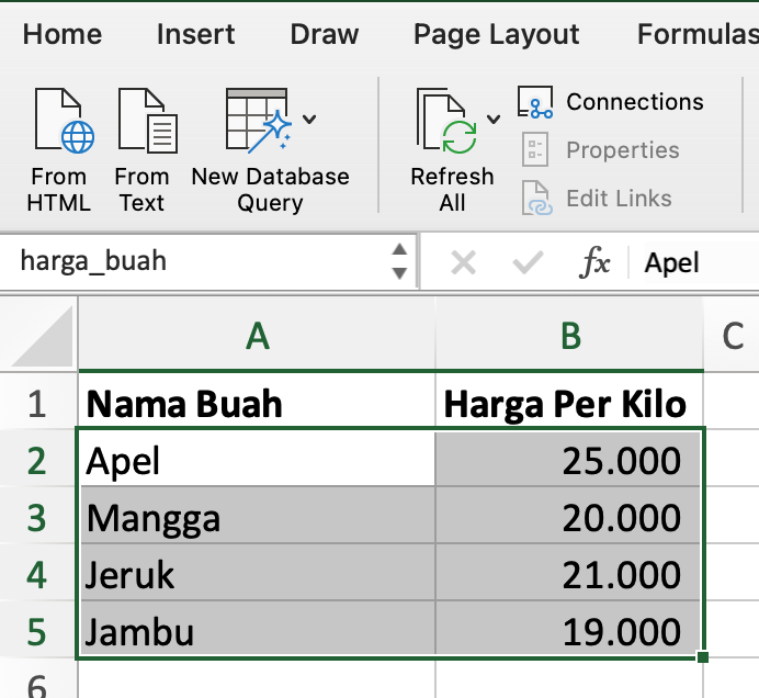 - Blok nama buah dan harga, kemudian beri label blok tersebut. Di sini kita beri label "harga_buah"