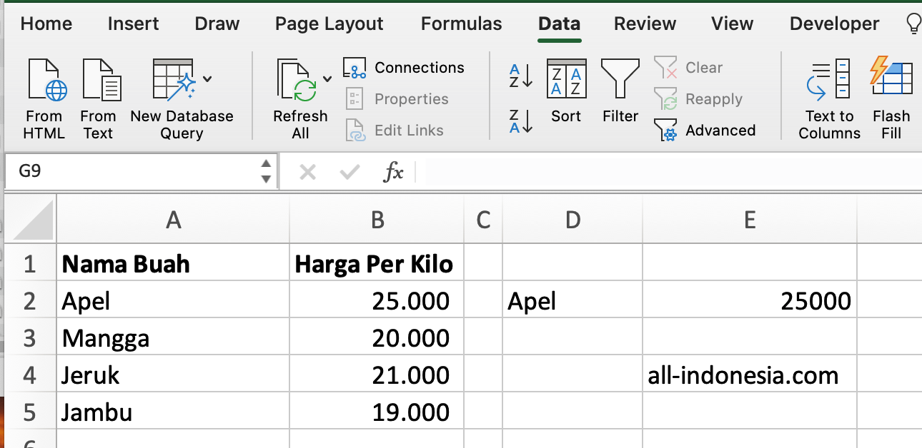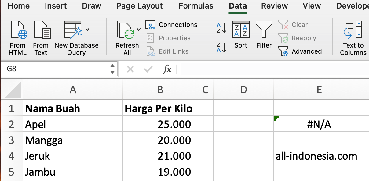 - Ketikkan nama buah di cell D2, misalnya "Apel" maka di cell E2 akan muncul harganya yaitu 25.000. Cobalah dengan mengubah nama buah sesuai dengan database. Maka harga yang muncul akan berubah-ubah sesuai dengan database anda.