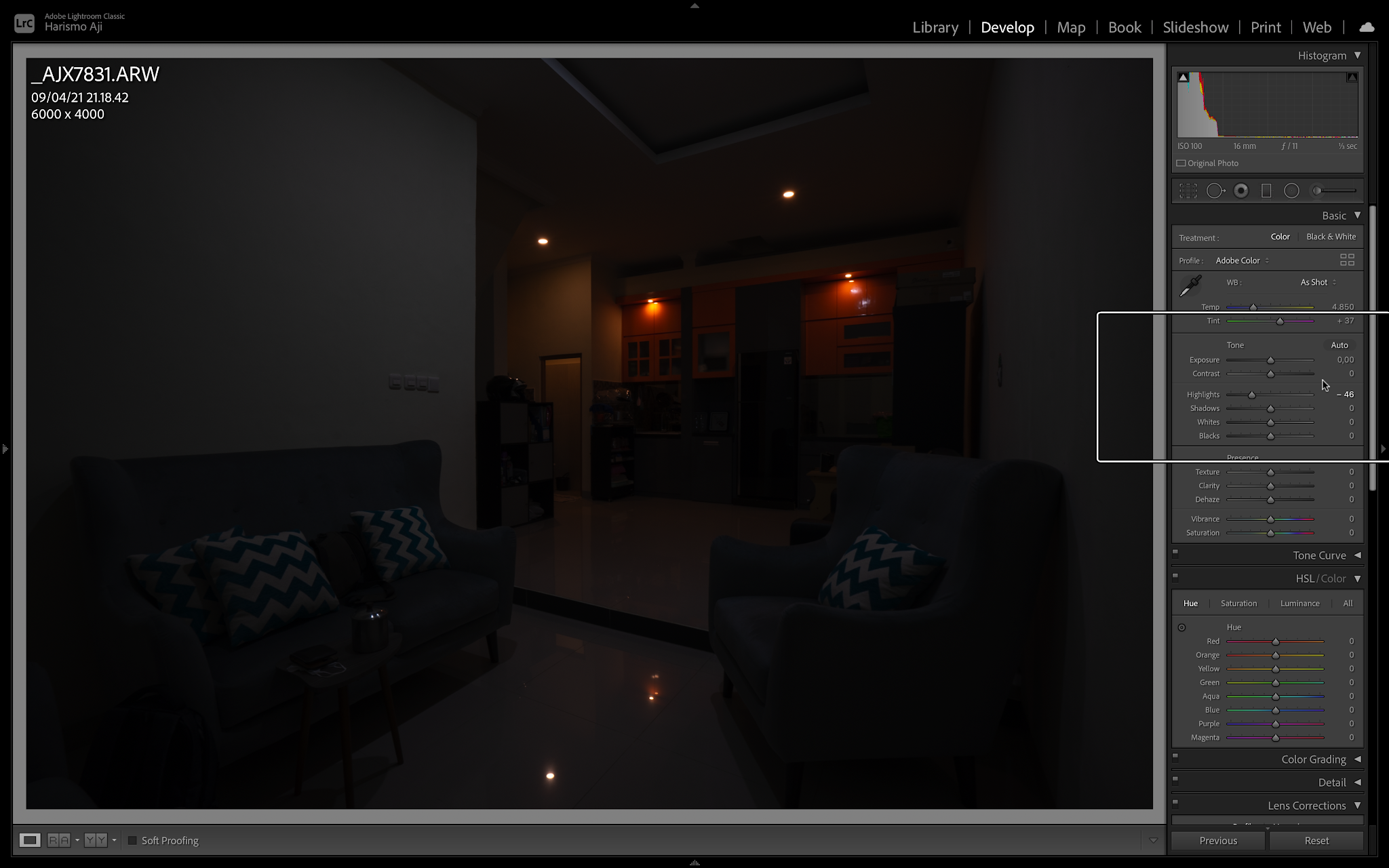 - Turunkan Hilights, sesuaikan dengan kebutuhan. Hilights adalah bagian dari foto yang terlihat lebih terang dari yang lain. Seperti cahaya lampu pada foto ini. Tujuannya adalah untuk tetap mempertahankan detail saat exposure dinaikkan. Kali ini hilights diatur ke angka -46.
