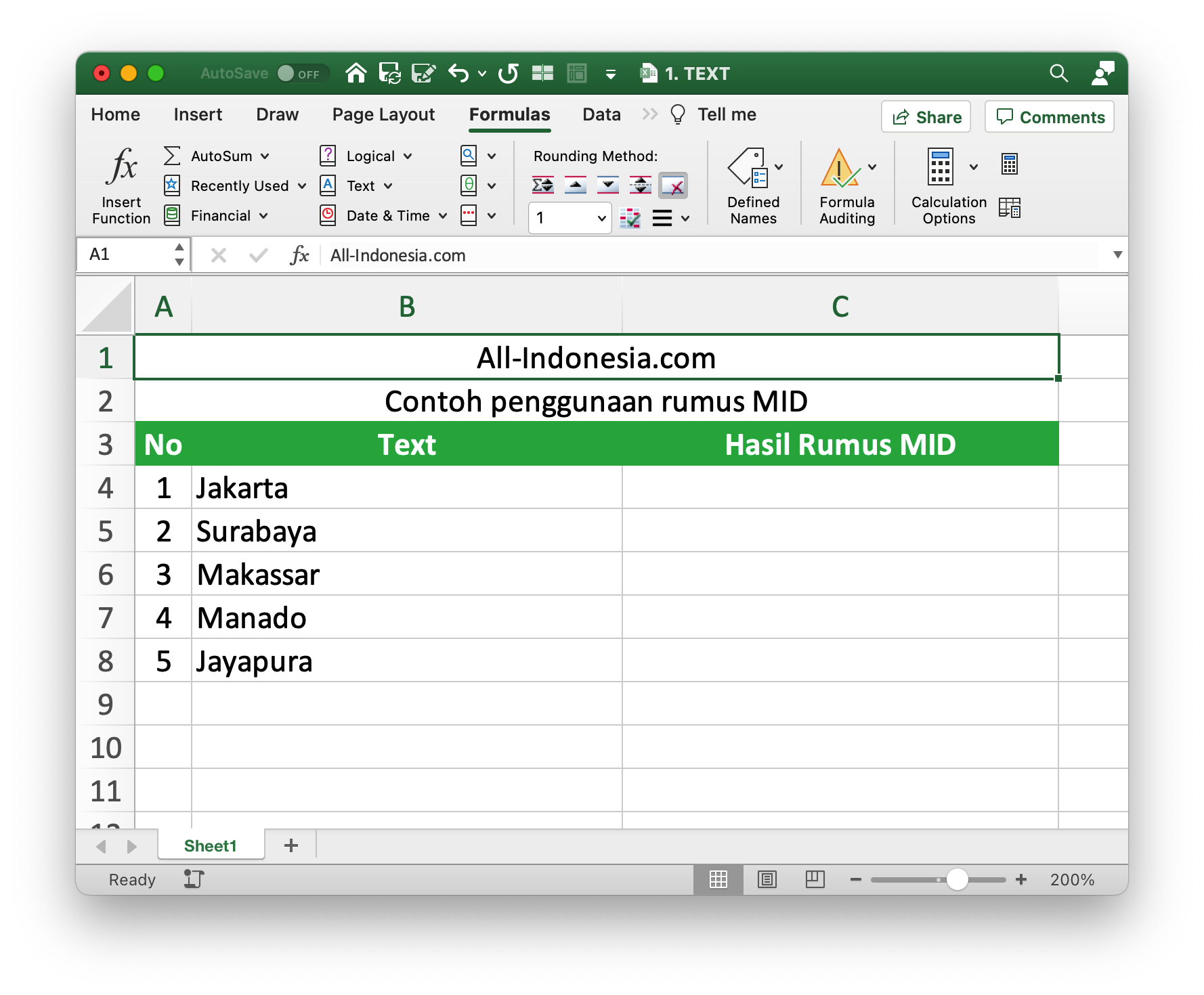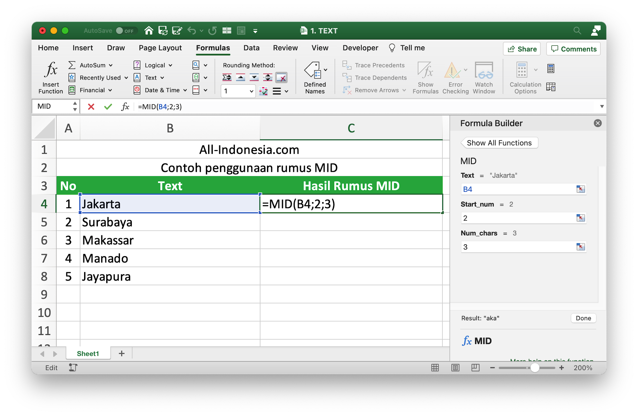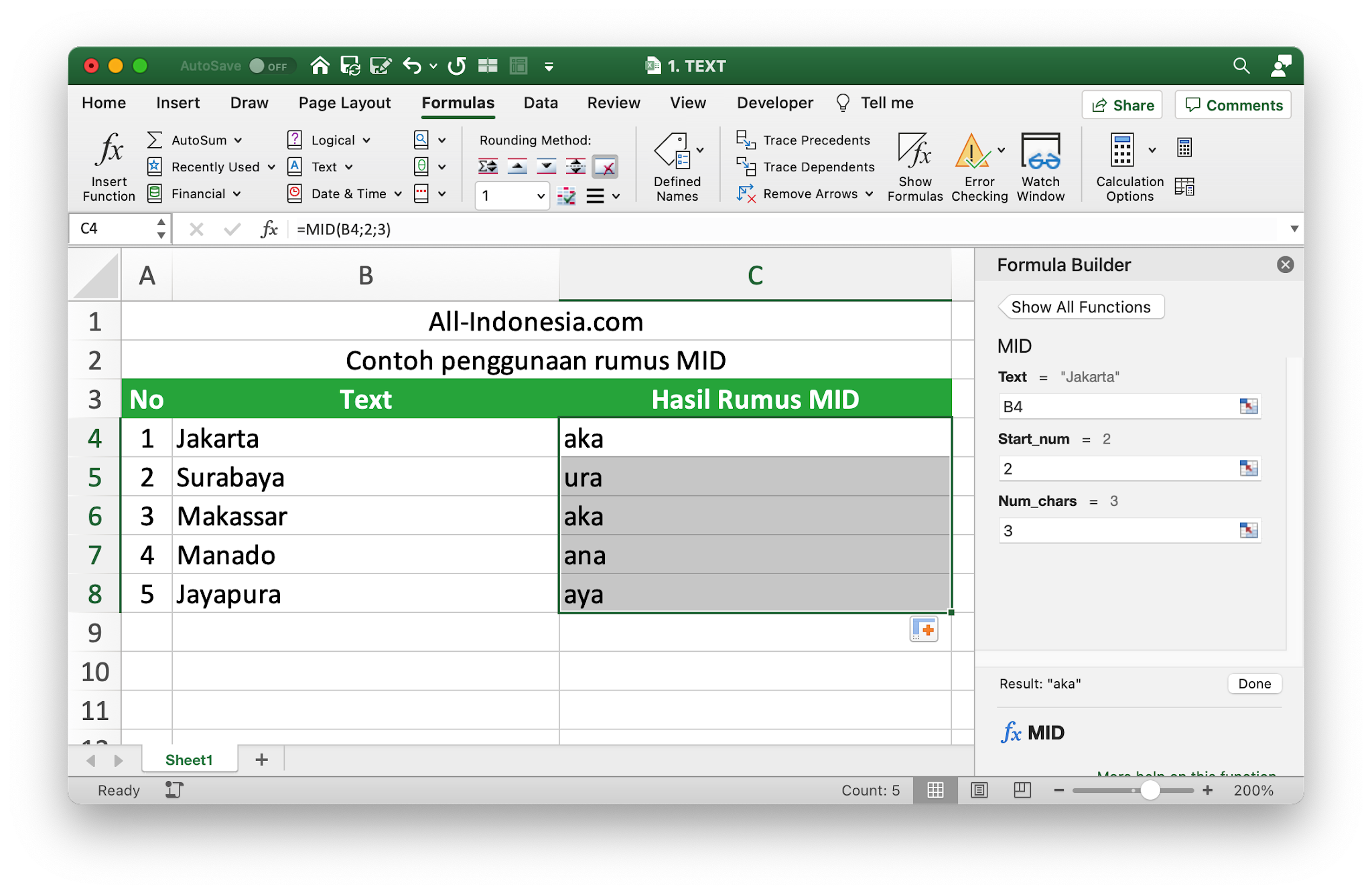 - Pilih cell dimana hasil dari Rumus MID ini akan ditampilkan, di sini akan dipilih cell C4. Kemudian pilih menu Formulas > Text > MID
