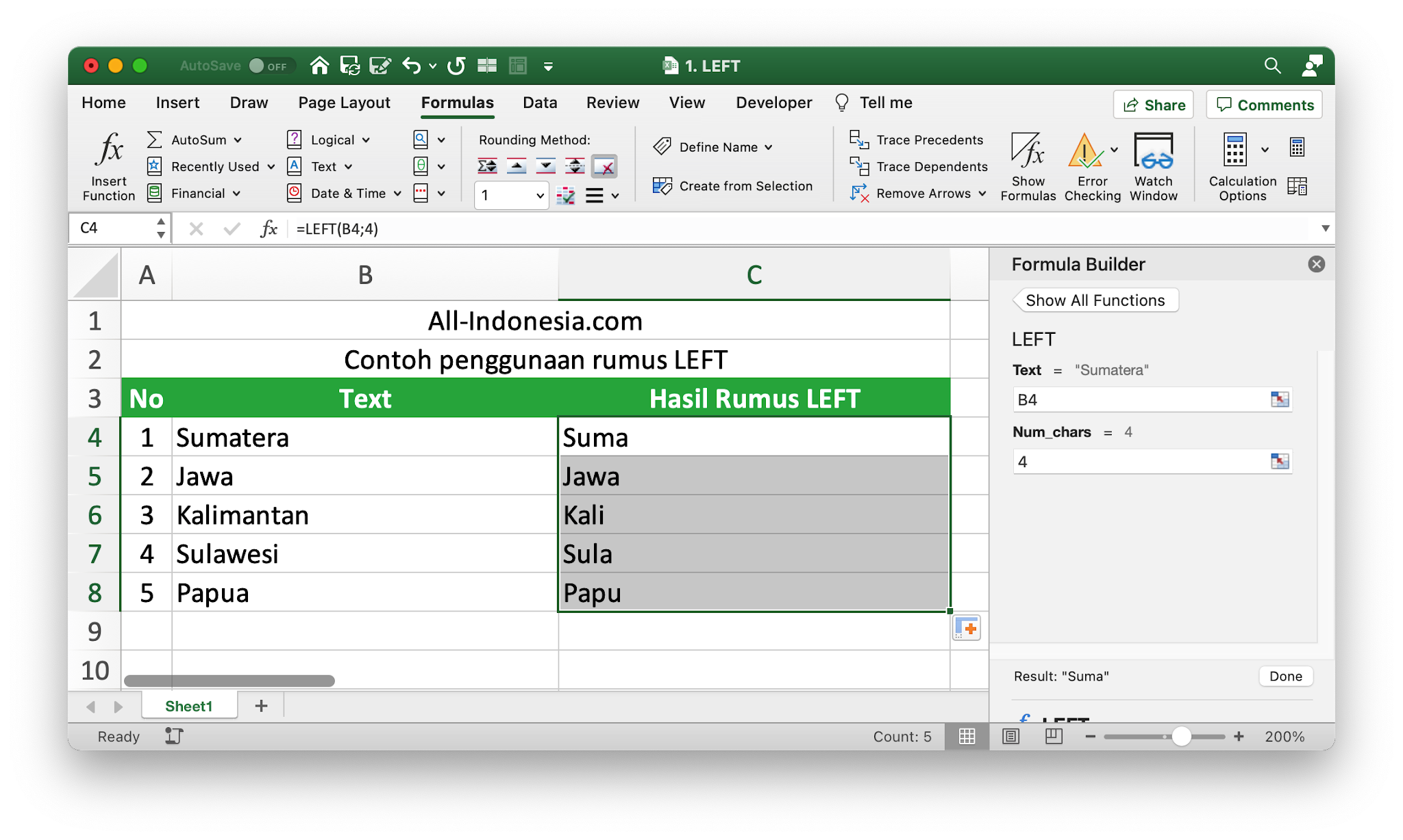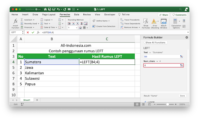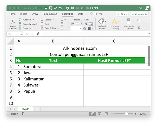 Rumus LEFT berfungsi untuk menemukan sejumlah karakter tertentu dalam teks pada cell yang dipilih. Berikut adalah contoh penggunaan rumus LEFT pada Excel.