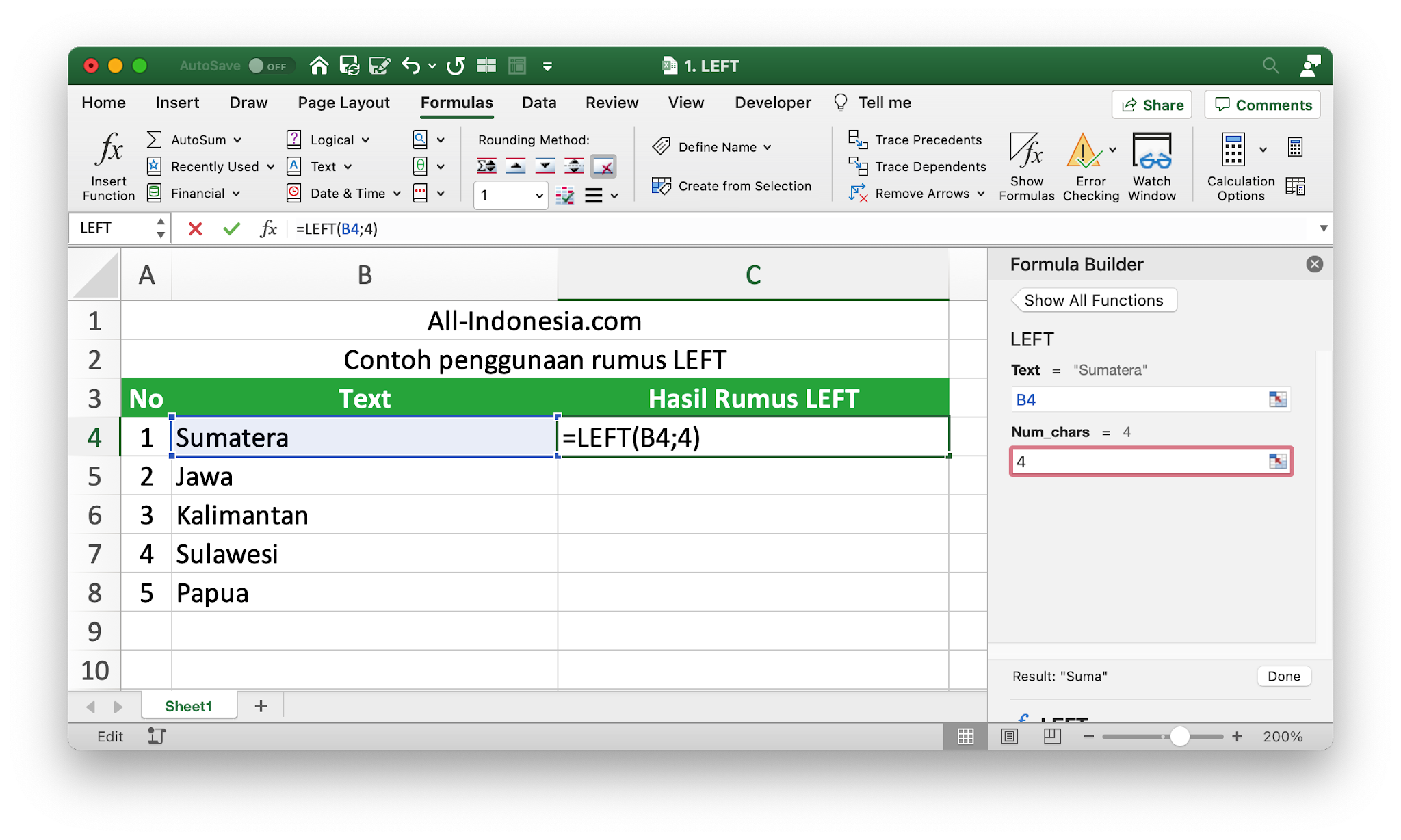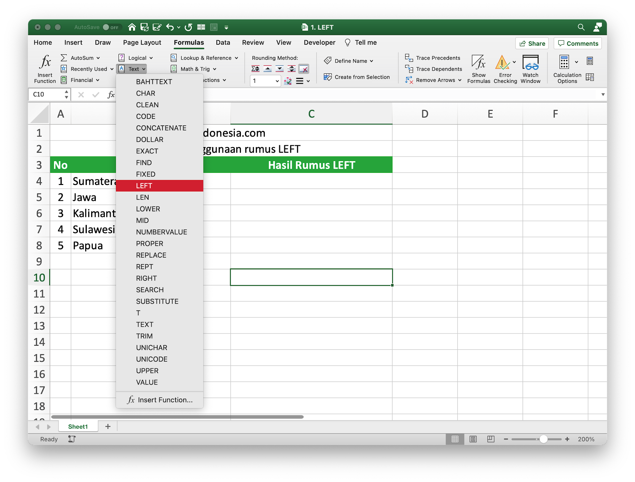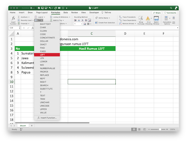 - Pilih cell dimana hasil Rumus LEFT akan ditempatkan, kemudian pilih menu Formula > Text > LEFT