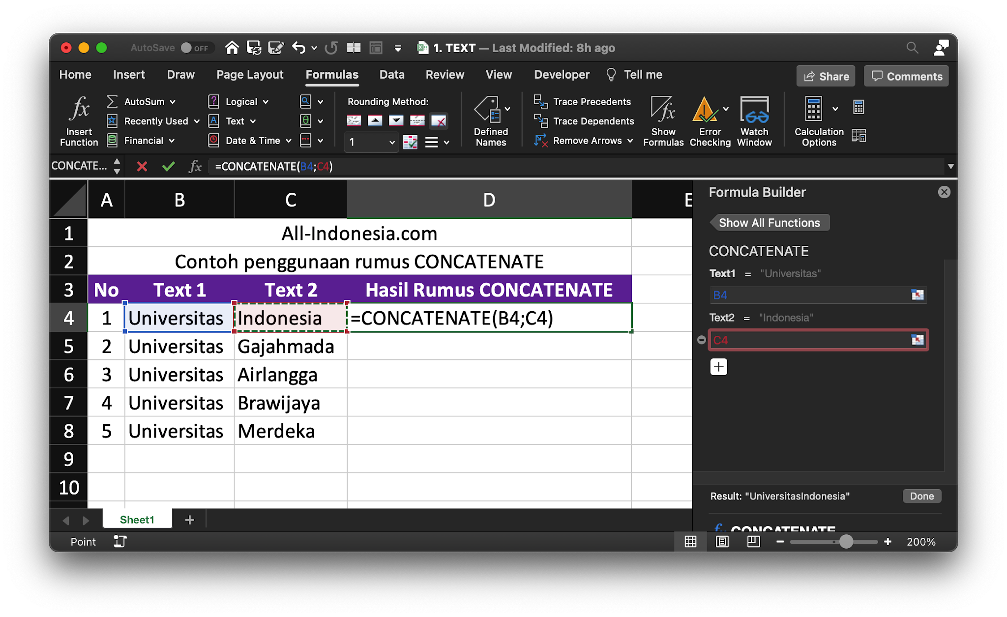 - Terlihat hasil rumus pada nomor 3. Teks yang dihasilkan terlihat menyambung tanpa spasi. Ada 2 solusi untuk mengatasi kondisi ini. Pertama kita bisa langsung tambahkan spasi langsung pada teks pertama dari yang semula "Universitas" menjadi "Universitas ". Kedua kita bisa tambahkan komponen parameter Rumus Concatenate ini dari yang semula hanya 2 komponen menjadi 3 komponen seperti berikut