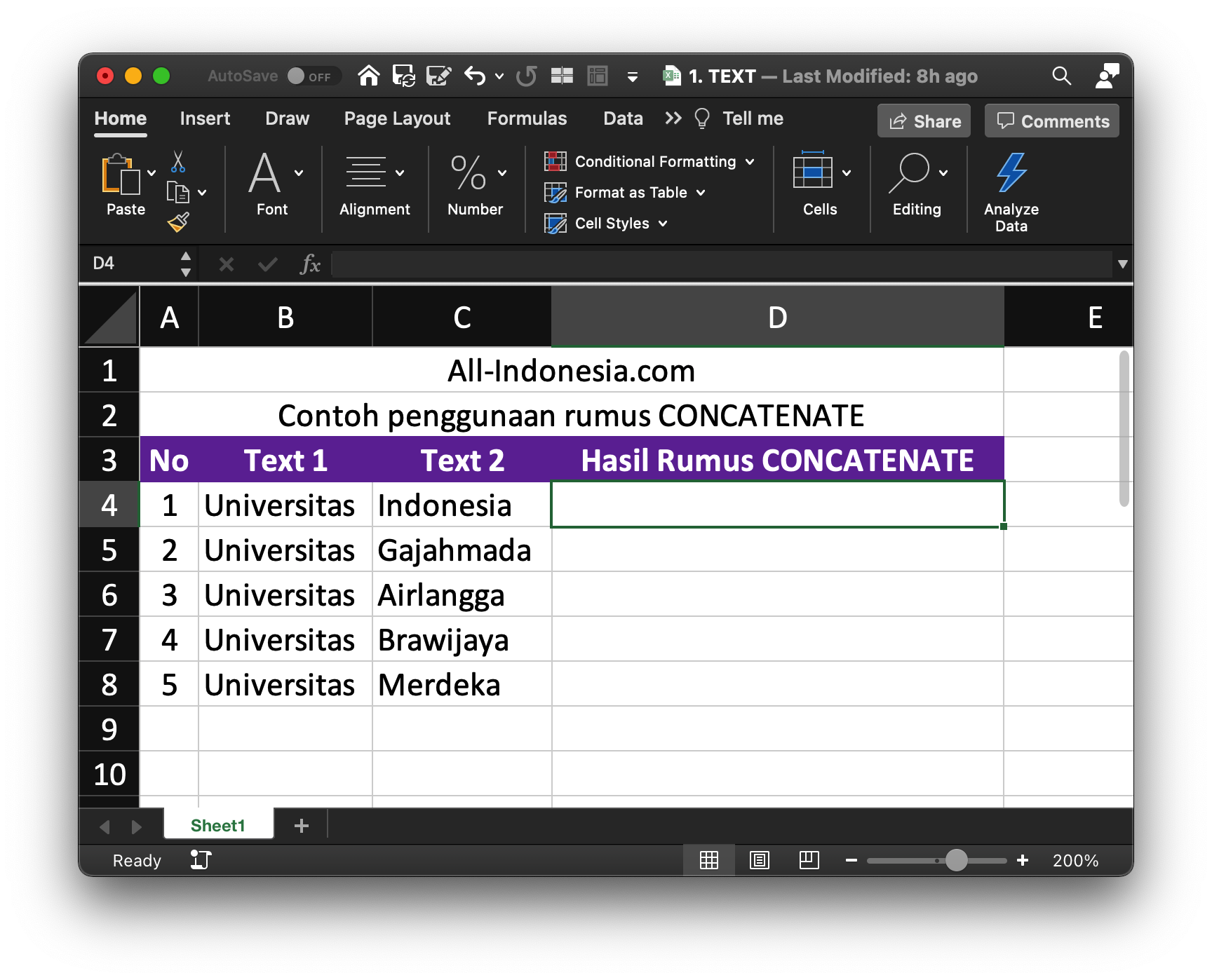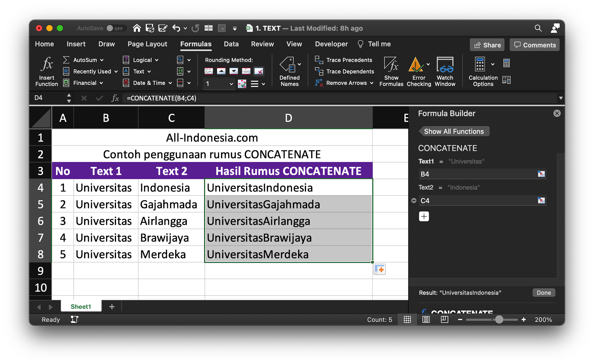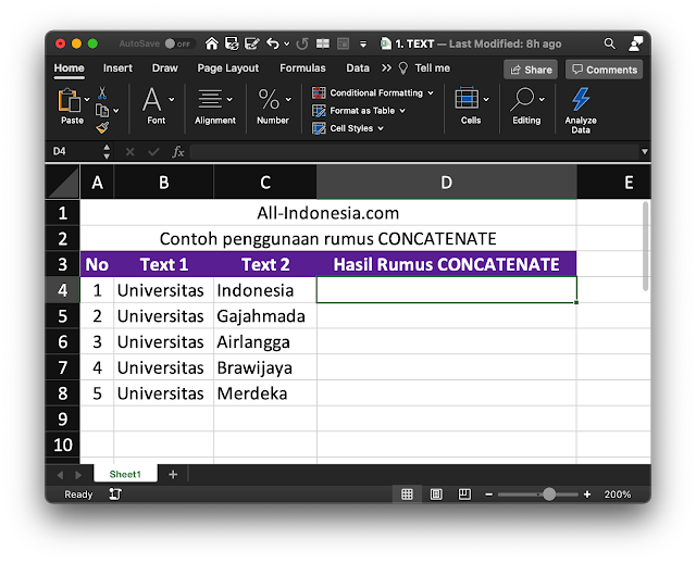 - Copy hasil rumus Concatenate ini ke cell-cell dibawahnya yaitu dari D5 sampai D8.