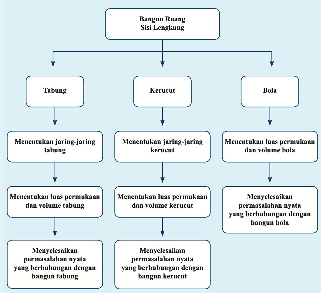 - Menyelesaikan masalah kontekstual yang berkaitan dengan luas permukaan dan volume bangun ruang sisi lengkung (tabung, kerucut, dan bola) serta gabungan beberapa bangun ruang sisi lengkung.